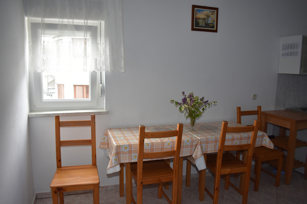 Apartman A6 smješten je u mirnom okruženju i nudi udobnost za odmor do tri osobe (2 odrasle + 1 pomoćni ležaj). Sastoji se od sobe s bračnim i pomoćnim krevetom, dodatnog pomoćnog kreveta u kuhinji, kuhinje i kupaonice s tuš kabinom. Apartman je opremljen posuđem za hranu i piće, hladnjakom i zamrzivačem (40 litara), TV-om sa satelitskim prijemnikom, klima uređajem, stropnim ventilatorom i besplatnim Wi-Fi internetom. Gosti mogu uživati na velikoj terasi, koristiti zajedničko dvorište od 500 m² s roštiljem i vanjskim tušem, uz prekrasan pogled na zelenilo. Pušenje u apartmanu je dozvoljeno.